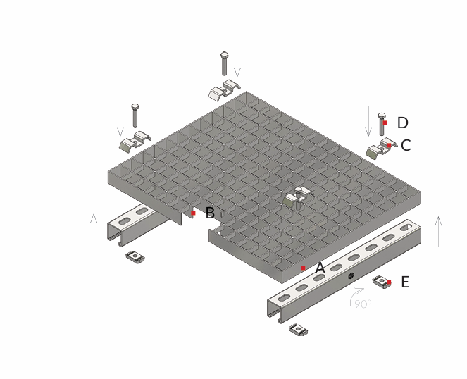 | Решетчатый настил СНХ | Несущая полоса настила | Арт. 241150 | Болт М8х80 Арт. 240578 | Монтажная скоба СНХ | Гайка М8 Арт. 240661 |